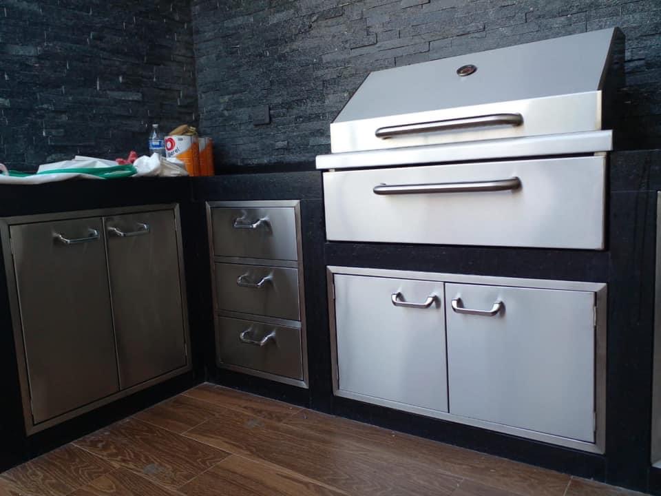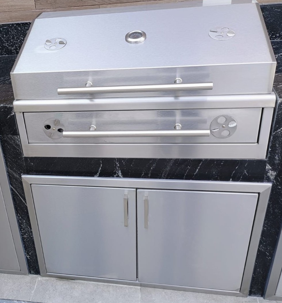 Doble cajón para carbón, doble puerta, varilla redonda, tapa o sistema de elevación, termostatos, ventilas en cajones y tapa. Charolas interiores.